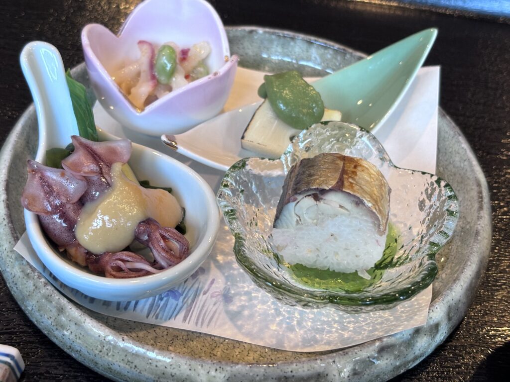 ↑料亭や旅館の食器を観察してみると思いのほか量産品が活躍しているのが分かる。写真の場合、下に敷いている皿以外は量産品。どんな陶磁器も演出の仕方次第ということだ。