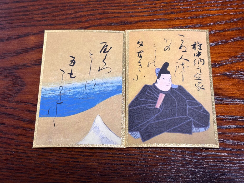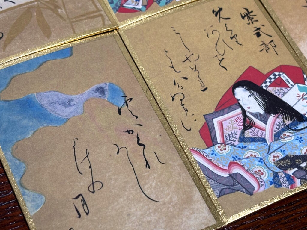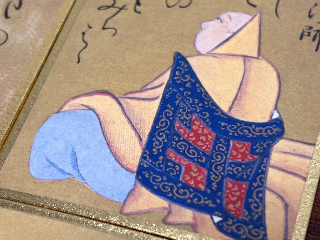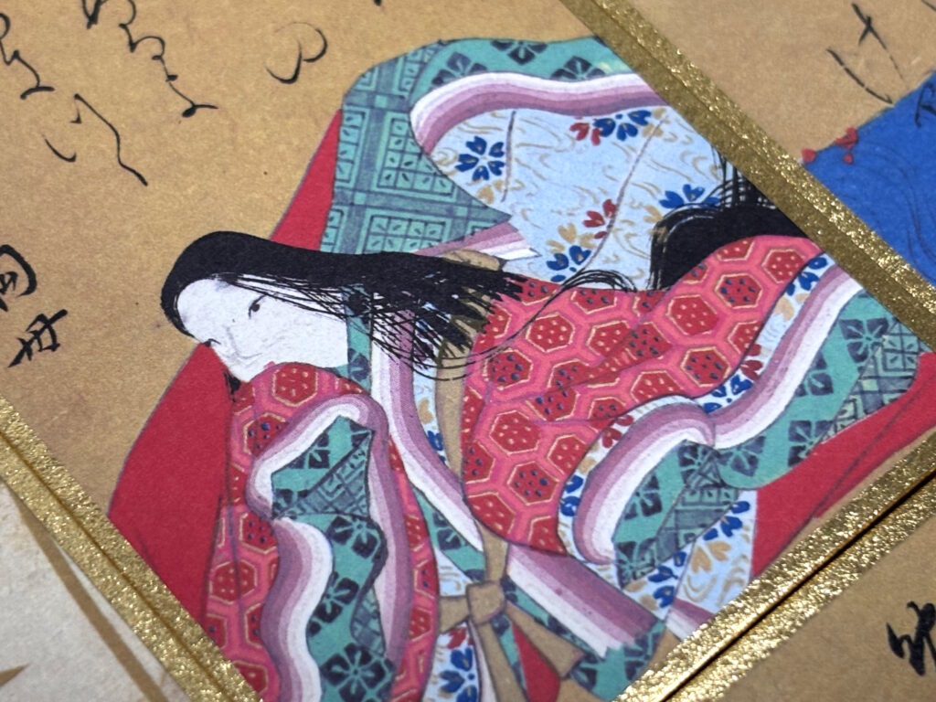 しかし本物は背景部分が泥金で重厚感のある輝きを持っています。さらに上の句の歌仙札に描かれた着物の模様までもが金細描で表現されており、その技術力の高さに舌を巻きました!まさかここまで金彩だったとは…!!